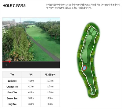7번 홀은 413m의 파 5홀로 약간 내리막입니다. 우측으로 휘어진 도드렉으로 우측으로의 티샷이 유리합니다. 롱홀이지만 티샷을 페어웨일에 안착시키면 투온이 가능합니다.