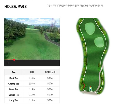 6번 홀은 114m의 파 3으로 약간 오르막홀입니다. 오르막을 고려하여 클럽을 선택하여야 하며 그린의 고저차이가 심하니 조심해야 합니다. 앞그린부커 약간 좌측으로 휘어져 우측으로 밀리면 OB가 날 수 있어요.