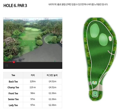 6번 홀은 98m의 내리막이 심한 파 3홀로 원온을 시켜 버디를 노려볼만한 홀입니다. 티잉그라운드 뒤쪽과 우측에 있는 연못이 아름다운 홀입니다.