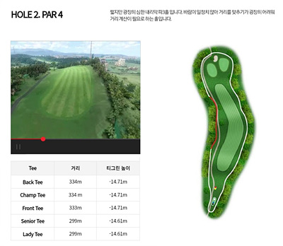 2번 홀은 내리막이 심한 333m의 파 4홀입니다. 좌로 약간 휘어져 있어 티샷은 페어웨이 중앙으로의 공략이 필요합니다. 내리막을 고려한 클럽 선택으로 2 온을 노려볼 만합니다.