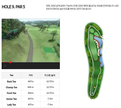 9번 홀은 446m의 파 5로 내리막홀입니다. 내리막이 있어 거리를 짧게 보아야 하며 우그린의 경우에는 해저드를 조심해야 합니다. 우측의 해저드와 벙커를 피하는 티샷 공략이 좋아요.
