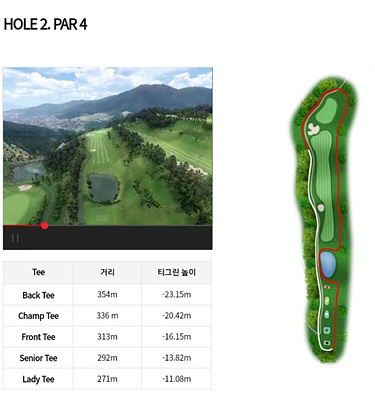 2번 홀은 313m의 파 4로 내리막이 심하여 거리를 짧게 보아야 합니다. 티샷 앞에 있는 연못이 심리적으로 부담을 주지만 거리가 짧아 투온을 노려볼만합니다.