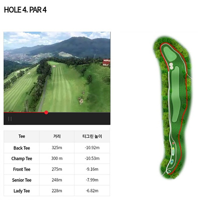 4번 홀은 275m의 파 4로 내리막입니다. 거리가 짧고 내리막이므로 티샷이 페어웨이를 지키면 투온이 무난하여 버디를 노려볼 만합니다.