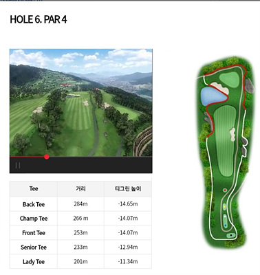6번 홀은 261m의 파 4로 오르막이 심한 홀입니다. 오르막을 고려하여 거리를 계산해야 하며 티샷을 페어웨이 중앙에 잘 안착시키면 투온이 가능한 홀입니다.