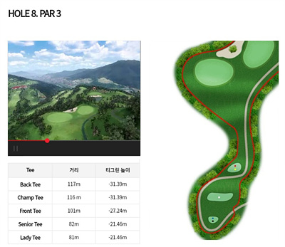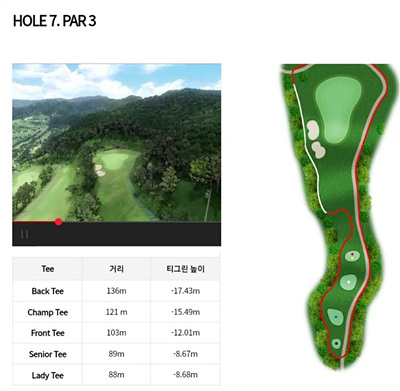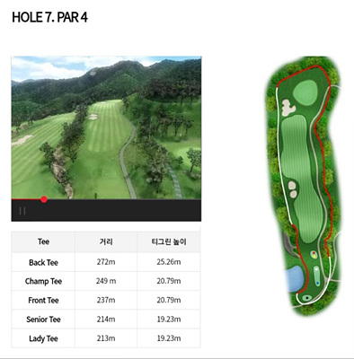 7번 홀은 237m의 파 4로 오르막이 심한 홀입니다. 페어웨이 좌측의 벙커를 넘기는 샷을 구사하면 투온이 가능하여 버디를 노려볼 수 있어요. 좌측이 OB지역이므로 조심해야 합니다.