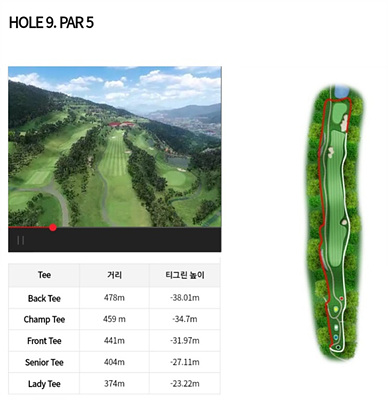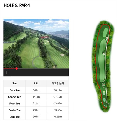 9번 홀은 311m의 파 4로 내리막홀입니다. 내리막을 고려한 클럽선택으로 투온을 노려볼 수 있습니다. 좌측은 대부분 해저드 지역이나 우측은 OB지역이니 이를 고려한 공략이 필요합니다.