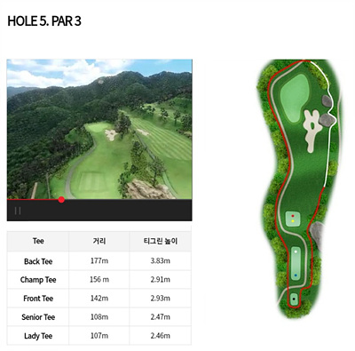 5번 홀은 324m의 평지홀입니다. 페어웨이가 넓고 직선 코스로 티샷을 잘 보내면 2 온을 노려 버디를 할 수 있습니다.
