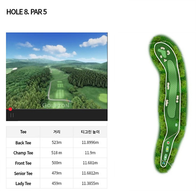 8번 홀은 500m의 긴 파 5로 오르막이 심하네요. 오르막과 좌로 약간 휘어진 홀임을 감안한 전략이 요구됩니다. 페어웨이를 벋어나면 전 지역이 OB이므로 주의해야 합니다.