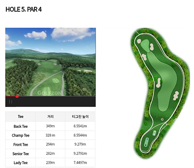 5번 홀은 294m의 파 4로 오르막입니다. 좌측으로 휘어진 도그렉홀로 좌측 첫번째 벙커의 우측 끝을 보고 티샷을 하면 페어웨이 중앙에 안착시킬 수 있겠네요. 그린 주변의 벙커도 조심하세요.