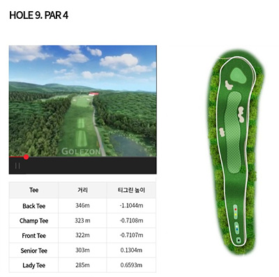 9번 홀은 322m의 파 4로 약간 내리막입니다. 페어웨이 좌우에 있는 벙커와 그린 왼쪽 앞의 벙커를 조심해야겠네요. 페어웨이 중앙에 티샷을 안착시키면 투온으로 버디를 노려볼 만합니다.