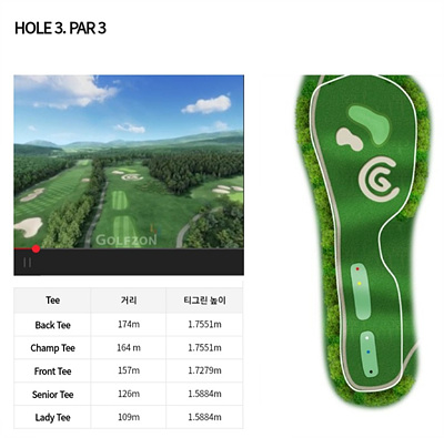 3번 홀은 157m의 파 3으로 약간 오르막입니다. 그린앞쪽의 G자로 만들어진 벙커가 인상적이네요. 파 3이지만 거리가 길기 때문에 클럽선택에 신중을 기해야겠습니다.