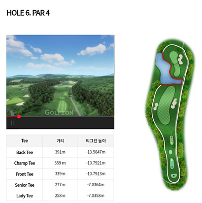 6번 홀은 339m의 내리막이 심한 홀입니다. 세컨드샷에서는 앞쪽에서 왼쪽으로 길게 배치된 연못의 해저드를 조심해야 합니다. 그린우측의 벙커도 피해야 좋은 점수를 낼 수 있습니다.