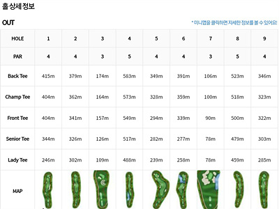 골프존 가상맵 스릭슨 브레이브 CC는 아웃코스와 인코스로 구성되어 있는데요. 각 홀별 거리와 기본 맵을 살펴보면 아래와 같습니다.