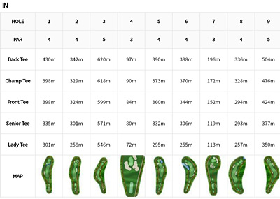 산의 특성을 잘 살리고 연못과 벙커 등을 아름답게 구성하여 매우 어렵지만 재미를 선사할 것입니다. 아웃 9홀과 인 9홀에 대한 정보를 확인하면서 끝까지 봐주세요!!!