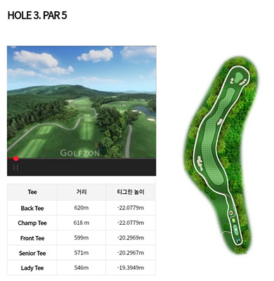 3번 홀은 599m의 파 5로 내리막이 심한 홀입니다. 우측으로 휘어진 도그렉홀로 그린 왼쪽에 보이는 벙커 오른쪽으로 공략하면 페어웨이에 잘 안착시킬 수 있겠네요. 그린 좌우에 배치된 벙커를 피하는 전략이 필요합니다.