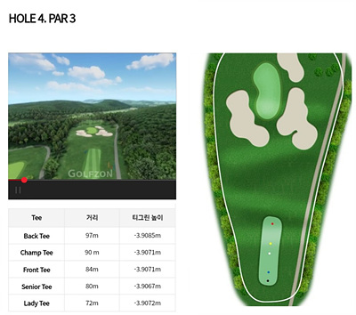 4번 홀은 84m의 파 3으로 내리막입니다. 그린 주변의 벙커가 심리적으로 부담이 되지만 짧은 거리를 고려하여 홀인원을 노려보세요. 내리막을 감안한 클럽선택이 필요합니다.