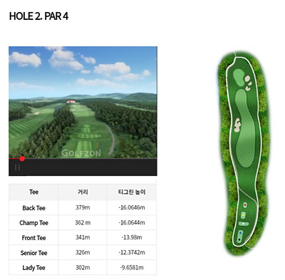 2번 홀은 324m의 내리막이 심한 홀입니다. 우측 벙커옆에 있는 나무를 보고 티샷을 공략하면 좋겠네요. 티샷을 페어웨이에 안착시키면 투온이 가능한 홀입니다. 정확한 거리를 계산하여 버디를 노려보세요.