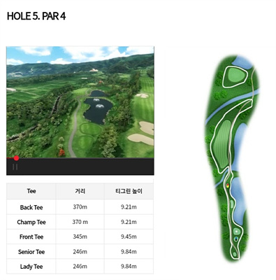 5번 홀은 345m의 파 4로 오르막입니다. 우측의 연못 분수가 아름다운 홀입니다. 하지만 페어웨이가 좁아 정확한 샷이 요구되며 페어웨이를 벋어나면 전 지역이 OB이므로 이를 감안한 공략이 요구됩니다.