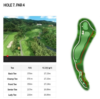 7번 홀은 350m의 오르막 홀입니다. 우측으로 휘어진 도그렉으로 티샷은 거리를 고려한 페어웨이 안착을 위한 공략이 요구됩니다. 좌측이 OB지역이므로 이를 피하는 전략이 중요합니다.