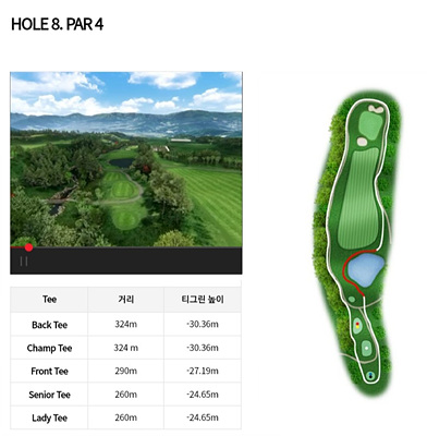 산세를 잘 살리고 그 위에 연못과 수로, 벙커 등을 조화롭고 친 환경적으로 설계된 코스는 매우 어렵지만 또 다른 재미를 선사할 것입니다. 아웃 9홀과 인 9홀에 대한 정보를 확인하면서 끝까지 봐주세요!!!