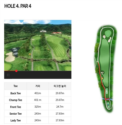 4번 홀은 475m의 내리막이 상당히 심한 파 5홀입니다. 좌측 숲 지역은 해저드이며 우측은 OB지역입니다. 중간에 카트길이 있으므로 이를 고려한 전략이 필요합니다.