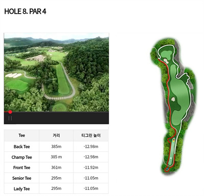 8번 홀은 361m의 파 4로 내리막입니다. 좌측은 해저드 지역이며 우측은 모두 OB지역입니다. 좌측으로 약간 휘어진 것은 고려하여 티샷을 해야 하겠네요. 그린 앞 좌측에 벙커가 있어 이를 피하는 공략이 중요합니다.