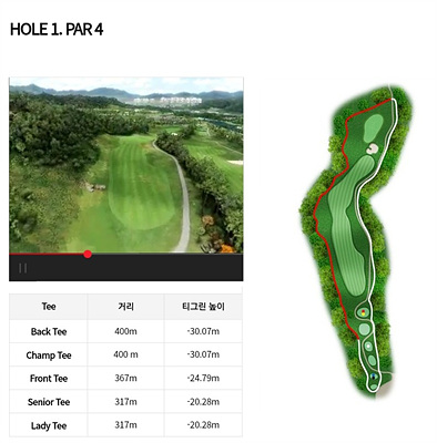1번 홀은 348m의 내리막이 심한 파 4홀입니다. 좌측으로 휘어진 도그렉으로 페어웨이 좌측에 보이는 나무 오른쪽으로 티샷을 해야 합니다. 내리막을 감안한 클럽선택으로 2 온을 시키면 버디가 가능합니다.