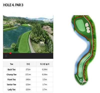 4번 홀은 148m의 파 3입니다. 좌측의 연못을 넘겨서 그린에 안착시켜야 하는 부담이 있지만 거리를 잘 고려하여 원온을 노려보세요. 우측으로 슬라이스가 나면 벙커에 빠질 수 있으니 조심해야 합니다.