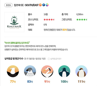 킹스락 CC는 그린과 코스가 별 4.5로 상당히 어려운 코스입니다. 골프 비기너에게는 다소 어려울 수 있습니다. 초보 골퍼분은 어느 정도 실력을 키우신 다음 도전해 보시는 것이 좋을 듯합니다.