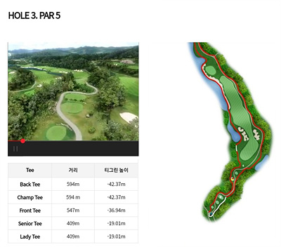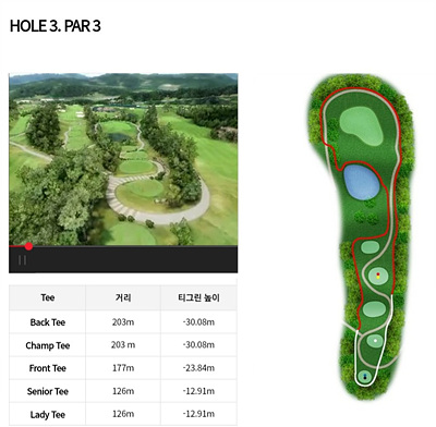 3번 홀은 177m의 파 3으로 내리막이 심한 홀입니다. 거리가 있지만 내리막을 감안한 클럽선택이 요구되네요. 중간에 있는 연못이 신경 쓰이지만 내리막이므로 원온을 노려볼만합니다.