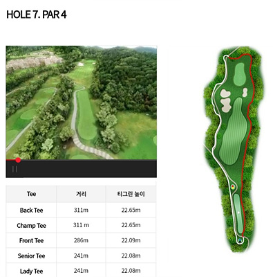 7번 홀은 286m의 파 4로 오르막입니다. 페어웨이가 끝나는 부분 좌측으로 벙커가 있어 조심해야 합니다. 티샷지역에서 페어웨이까지가 좁아 정교한 샷이 요구됩니다.