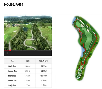 6번 홀은 342m의 파 4로 내리막이 심한 홀입니다. 좌측으로 휘어진 도그렉으로 휘어지는 부분 오른쪽에 있는 벙커 방향으로 티샷을 하세요. 세컨드샷의 경우 오른쪽이 OB지역임을 고려하여 공략해야 합니다.