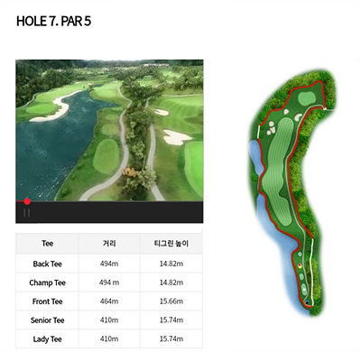 7번 홀은 464m의 파 5로 오르막입니다. 티샷지역 앞에 길게 보이는 연못이 멘털을 흔들 수 있는데요. 거리와 페어웨이의 상황을 잘 고려한 클럽선택이 중요합니다. 티샷지역 오른쪽에 OB지역이 있고 나머지는 해저드임을 고려한 전략을 세워 보세요.